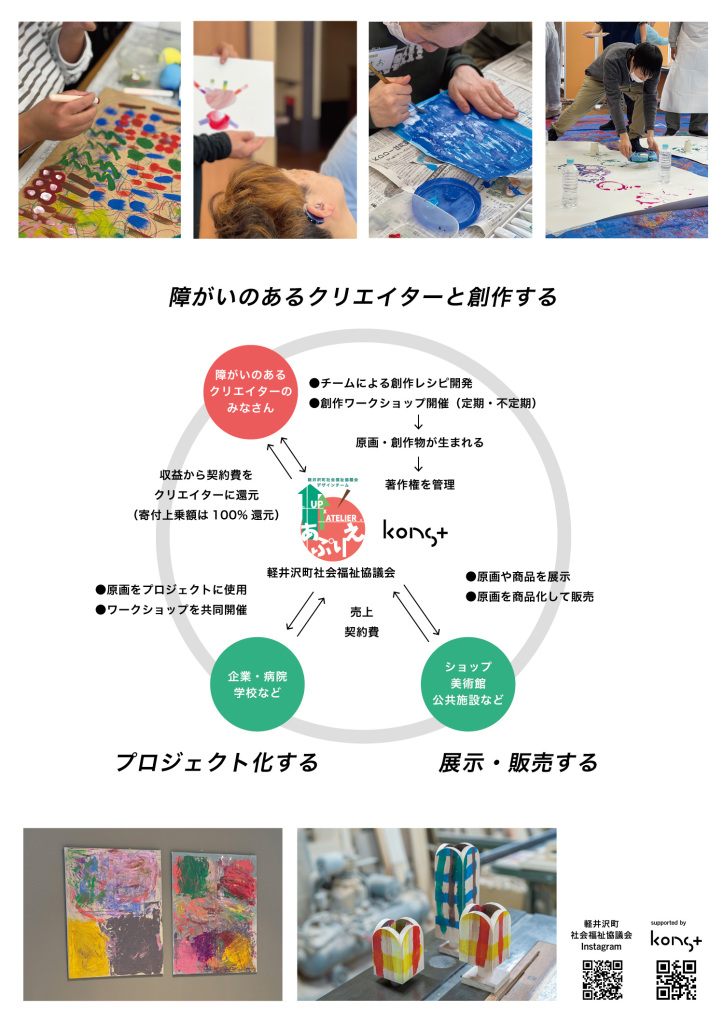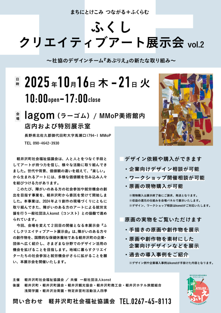御代田町MMoP美術館内「lagom(ラーゴム)」にて、前回大変ご好評をいただきました、障がいのある方々の創作物を企業・団体へ広く紹介し、さまざまな分野でのデザイン活用の機会を拡げることを目指す「ふくしクリティブアート展示会」の第2回を開催いたします。
