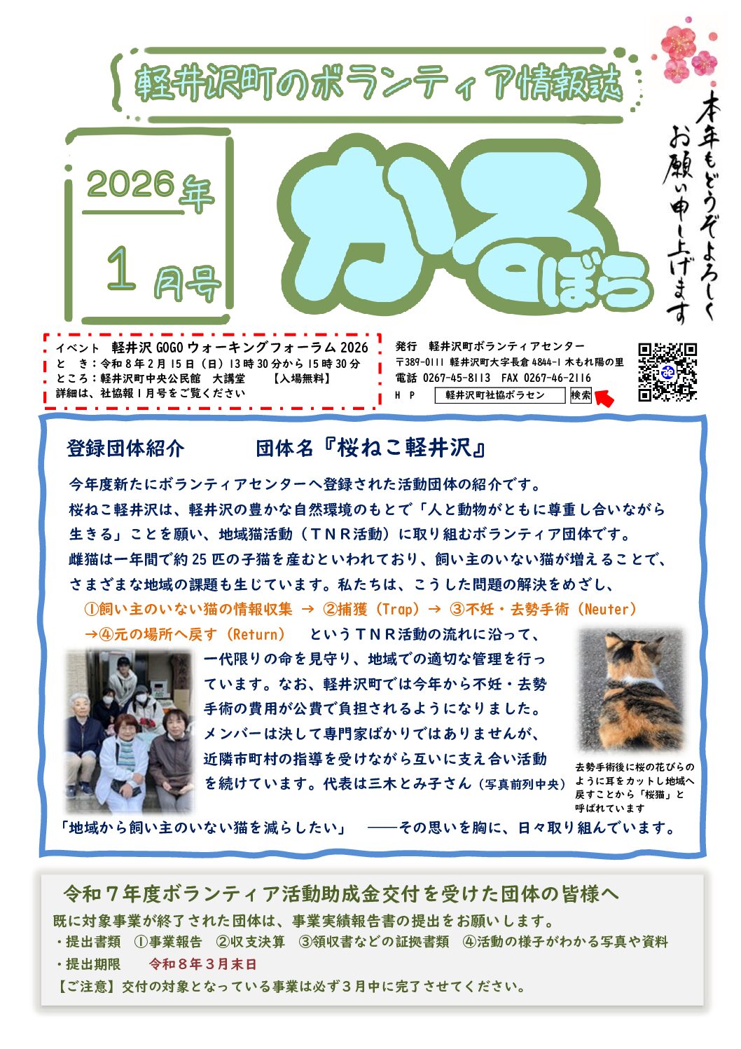 イベント「軽井沢GOGOワーキングフォーラム2026」 登録団体紹介 団体名「桜ねこ軽井沢」 令和7年度ボランティア活動助成金交付を受けた団体の皆様へ 第32回軽井沢町社会福祉大会で『ほっとここあ』が表彰されました 災害ボランティア支援に関する協定を締結しました 第14回「ちいき活動みほん市」に出展しませんか 災害現場で活躍!ドローン学習